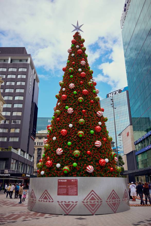 Auckland’s beloved 18.4-metre Christmas tree returns to Te Komititanga, glowing with more than 10,000 LED lights, 4,000 pohutukawa flowers and 200 baubles.The tree lights up with a five-minute projection show every ten minutes.