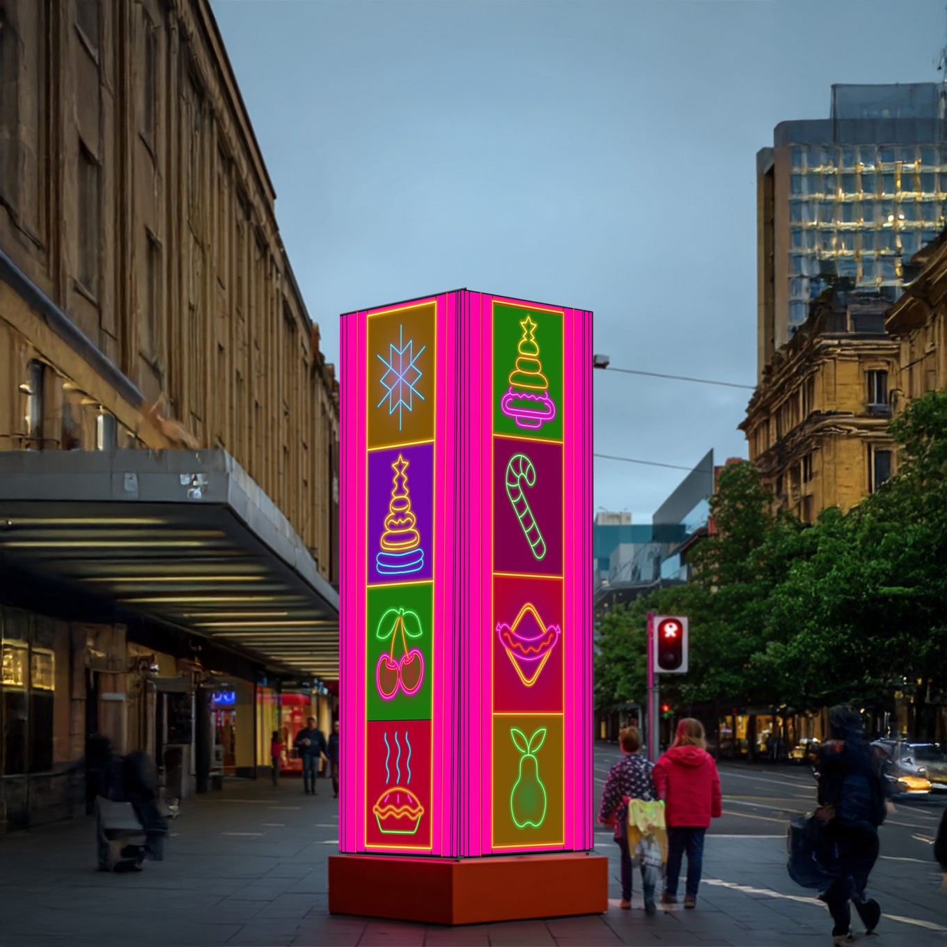 Queen Street becomes a vibrant light trail with five-metre interactive neon columns created by artist Angus Muir. Each column has its own theme: